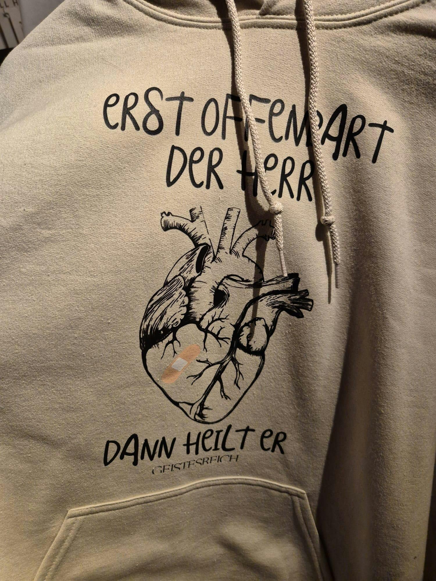 At the top it says "Only on the Lord will the Lord reveal himself", at the bottom "then he will heal" - in the middle is a heart with a plaster, which stands for healing, care and love.